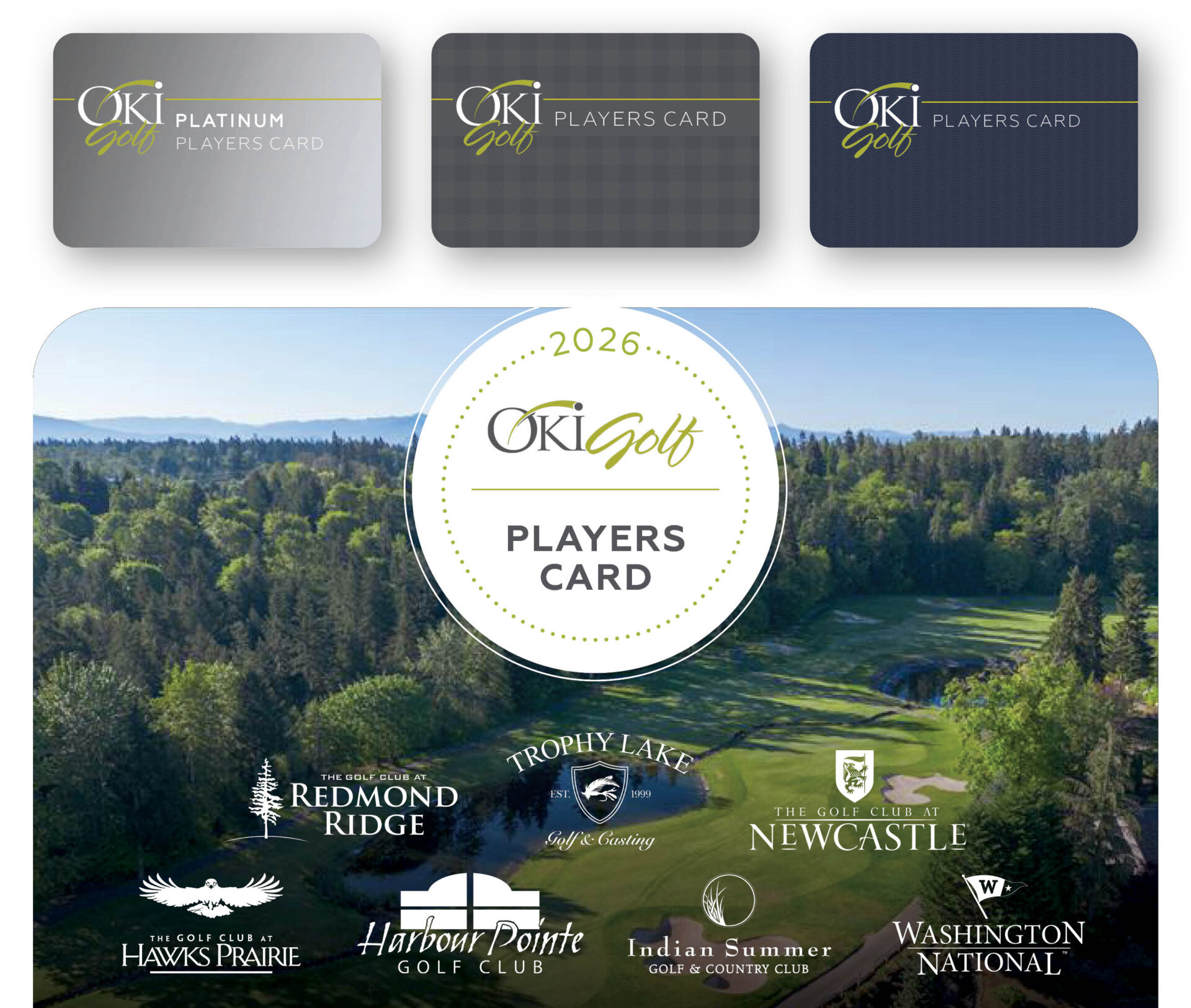 Original Players Card includes one prepaid round (redeemable any day of the week, any time of day), cart included, redeemable at Newcastle-China Creek, Indian Summer, Washington National, Redmond Ridge, Harbour Pointe, Hawks Prairie-The Links & Woodlands, or Trophy Lake.